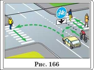 Читач А: Наскільки я зрозумів, водій, який здійснює на перехресті поворот в будь-яку сторону, повинен бути готовий, якщо це буде потрібно, дати дорогу пішоходам, а при перетині велосипедної доріжки - і велосипедистам (рис. 166).