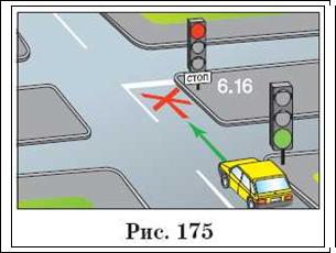 І водій автомобіля, на рис. 175, зможе продовжити рух тільки при зеленому сигналі світлофора, розташованого у стоп-лінії.