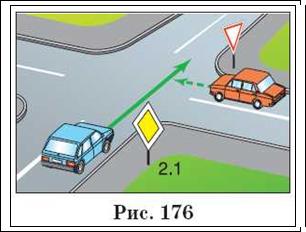 Читач Б: Тут все просто, знаки пріоритету підказують, що водій автомобіля, що знаходиться на другорядній дорозі (знак 2.4), повинен поступитися автомобілю, який рухається по головній дорозі (знак 2.1) (рис. 176)