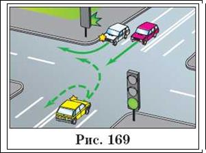 При повороті наліво або розвороті по зеленому сигналу світлофора водій безрейкового транспортного засобу зобов'язаний дати дорогу транспортним засобам, які рухаються зі зустрічного напрямку прямо і направо (рис. 169) Таким же правилом повинні керуватися між собою водії трамваїв.