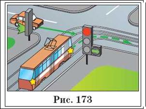 Автор: Це пов'язано з тим, що трамвай «прив'язаний» до рейок і позбавлений можливості маневрувати на дорозі, а також з-за більшого, у порівнянні з безрейковим транспортним засобом, гальмівного шляху Але, якщо трамвай рухається на включену стрілку в додатковій секції при основному заборонному сигналі світлофора, він повинен дати дорогу (рис. 173)