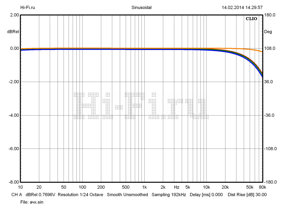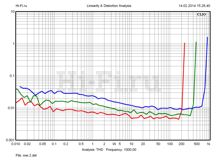 Частотна характеристика попередня підсілювача Burmester 808 MK5 показана на рис. 1 помаранчевим кольором. Вона абсолютно лінійна в чутному діапазоні частот, а спад в надтональной області мізерно малий. На цьому ж малюнку представлені частотні залежності в зв'язці з підсилювачем потужності Burmester 909 MK5 (для навантаження 8, 4 і 2 Ом). Три останні криві практично зливаються в одне ціле, що не дивно - коефіцієнт демпфірування підсилювача дорівнює рекордним 820 од.! Нерівномірність у смузі звукових частот не перевищує 0,1 дБ. Спад характеристики на частоті 80 кГц складає всього 1,5 дБ. Зі зміною номіналу баласту і збільшенням рівня сигналу зазначені величини не зазнають змін. Значення максимальної вихідної потужності змінюється пропорційно номіналу підключеного навантаження, що свідчить про практично необмеженій енергетичному запасі блоку живлення пристрою (рис. 3). Для 2 Ом ми отримали значення 905 Вт. Стереоканали чудово ізольовані один від одного (рис. 2). Проникнення на частоті 10 кГц - не більше -68 дБ.