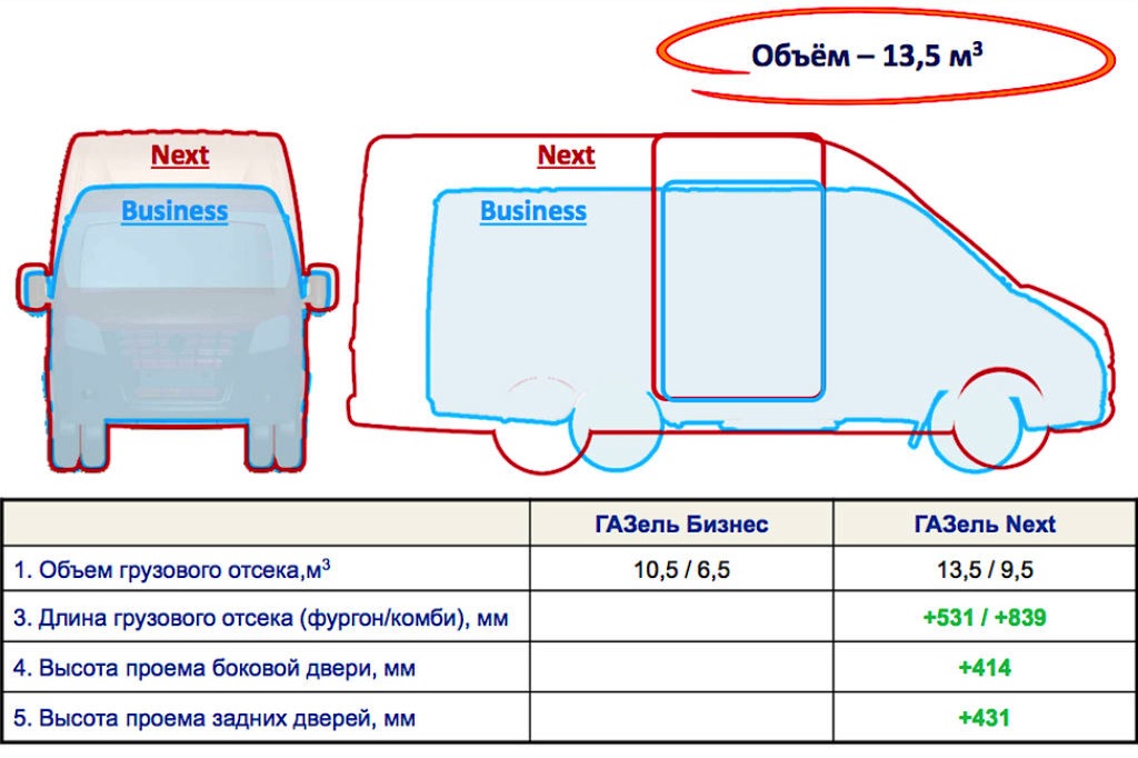 У всіх варіантах виконання «вантажний фургон» присутній лючок під пасажирським сидінням, що дозволяє перевозити довгомірні (до 5 м) вантажі. Конкуренти ж пропонують це рішення як опцію, а у деяких її просто не існує. Дизайн вантажної платформи продуманий до дрібниць: тут і такелажні петлі, і 9-мм фанерний настил, і бічна оббивка кузова, магнітні фіксатори дверей, які розчиняються як на 90 так і на 270 градусів. І ще один важливий козир NEXT на тлі однокласників - рама. Її посилили додатковими вставками, власне ця рама без якихось змін піде на наступну новинку ГАЗу - більш важкий фургон з загальною масою до 4,6 тонн. Адже ми це з вами знаємо - запасу міцності в Росії мало не буває. Дорого коштує і оригінальна задня підвіска, з включающимся в роботу третім листом при максимальному завантаженні. Укупі з передньої, незалежної, підвіскою гарантований комфорт при різних варіантах завантаження. Для того щоб побачити наскільки новий фургон відрізняється від свого попередника, зверніть увагу на наше слайдшоу.