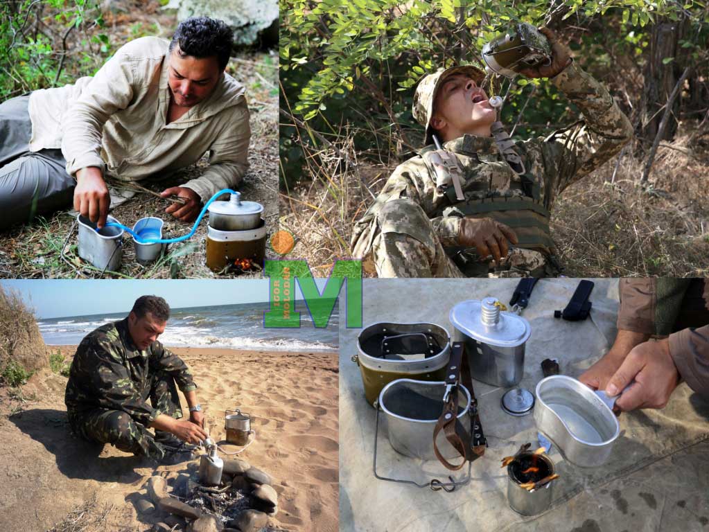 8. Я дійсно успішно розтоплював сніг в казанку і готував в ньому перші страви, заварював хвойний відвар, переносив додатковий обсяг води в поєднанні з наповненою флягою. Миску використовував як ковша для забору води та при копанні піску або землі, для приготування других страв, а так само в якості сковороди. Стакан використовувався не часто, в основному для охолодження приготованого відвару (чаю) і вживання вже завареного напою, перенесення шланга і як охолоджувач під час дистиляції рідини. Решітка, скоба, прокладка, обвіс, гачок і шланг використовувалися за своїм призначенням у міру необхідності.
