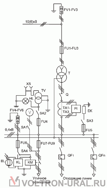 1 FV1-FV3 Разрядник вентильний 10 (6) кВ * 3 2 FV4-FV6 Разрядник вентильний 0,4 кВ * 3 3 FU1-FU3 Запобіжник ПКТ 10 (6) кВ 3 4 Q Роз'єднувач 0,4 кВ 1 5 FU4-FU6 Запобіжник 10 А 3 6 FU7-FU9 Запобіжник 16 А 3 7 TA1-TA3 Трансформатор струму 3 8 SA1-SA4 Вимикач 380В / 16А 2 9 SA2-SA3 Перемикач 380В / 10А 2 10 PI Лічильник активної енергії 1 11 EK Резистор підігріву 1OOW 2 12 BL, KL Фотореле 1 13 KM Пускач магнітний ПМ 1 14 HL Патрон стельовий Е27 1 15 V Вольтметр 0-500В 1 16 XS Розетка штепсельна 36В 1 17 TV Трансформатор понижуючий 220 / 36В 1 18 QF1-QFn Вимикач автоматичний (або рубильник із запобіжниками) до 5 19 T Силовий т ансформатор ** 1