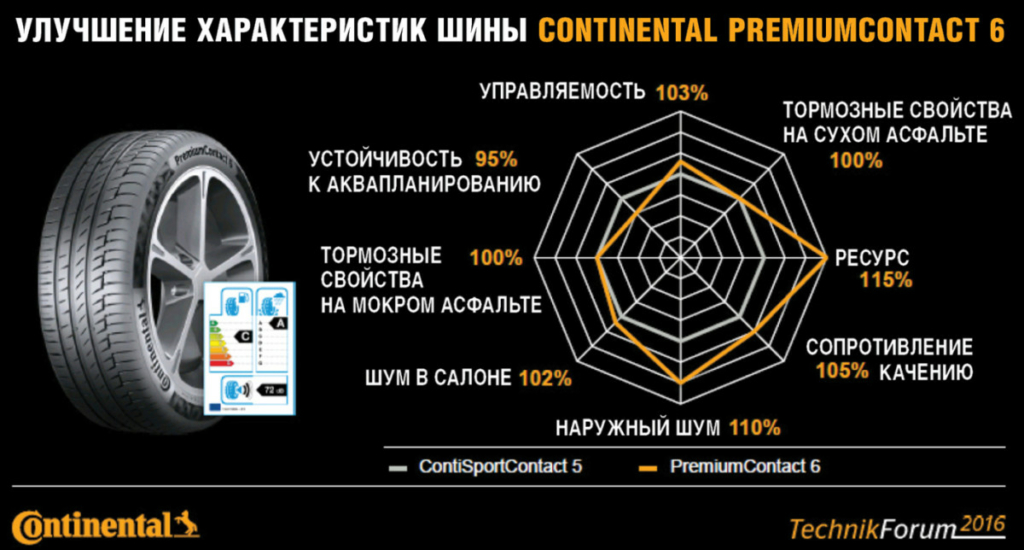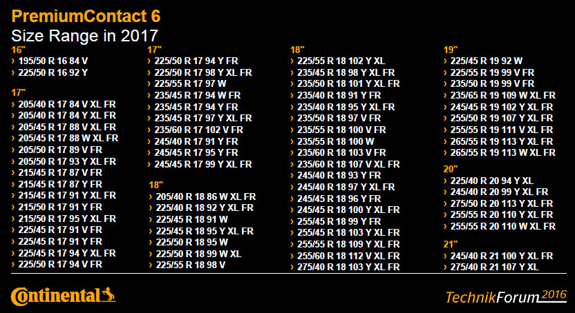 Мабуть, вперше, компанія Continental в найближчому літньому сезоні виведе на ринок «автомаркета» нову шину Continental PremiumContact 6 з величезною кількістю типорозмірів. Так вже з весни 2017 року продажу буде представлено 70 (!) Типорозмірів нової шини PremiumContact 6. Кожен з розмірів вже протестований і запущений у виробництво на заводі в Німеччині. Це будуть розміри з посадковим діаметром від 16 до 21 дюйма і з шириною профілю від 195 мм до 275 мм. Залежно від типорозміру шини індекси швидкості будуть охоплювати потреби автомобілів зі швидкісними можливостями до 300 км / ч. Але, як виявилося, не це найголовніше в новинці.