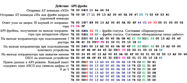 Різні блоки фрейма виділені кольором і типом шрифту. Наведені приклади можуть бути корисними при вивченні розділу, присвяченому розділу по роботі з API-фреймами в оригінальному описі виробника [5] (російськомовний переклад даного документа доступний за запитом на [email protected] ).