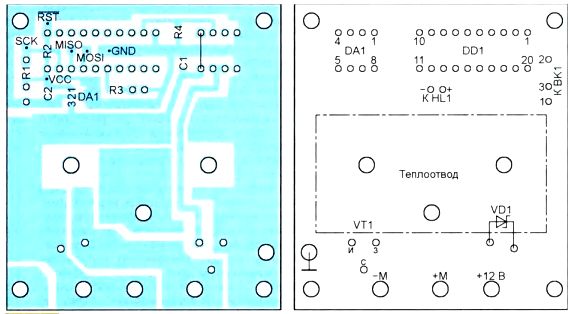 Плата розрахована на установку резисторів і конденсаторів типорозміру 1 206 для поверхневого монтажу. Діод SR2040 (URL: http://files.rct.ru/pdf/diode/5261755198365.pdf (27.06.16)) - в двохвивідною корпусі Т0220АС. Разом з транзистором IRF3808 він закріплений із застосуванням теплопровідної пасти на загальному тепловідведення з площею охолоджуючої поверхні близько 60 см2.