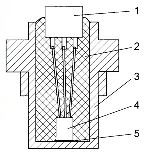 Датчик DS18B20 (ВК1) слід помістити в корпус від штатного контактного датчика температури охолоджуючої рідини, з якого попередньо слід видалити всю «начинку». Такий корпус можна і виточити з латуні зі збереженням габаритних і приєднувальних розмірів. Розміщення датчика DS18B20 в корпусі показано на рис. 5. Датчик 4 з припаяним до його висновків роз'ємом 1 поміщають в порожнину корпусу 3 так, щоб його верхівка, на яку нанесений шар теплопровідної пасти 5, стосувалася дна порожнини. Після цього порожнину заливають термостійким герметиком 2.