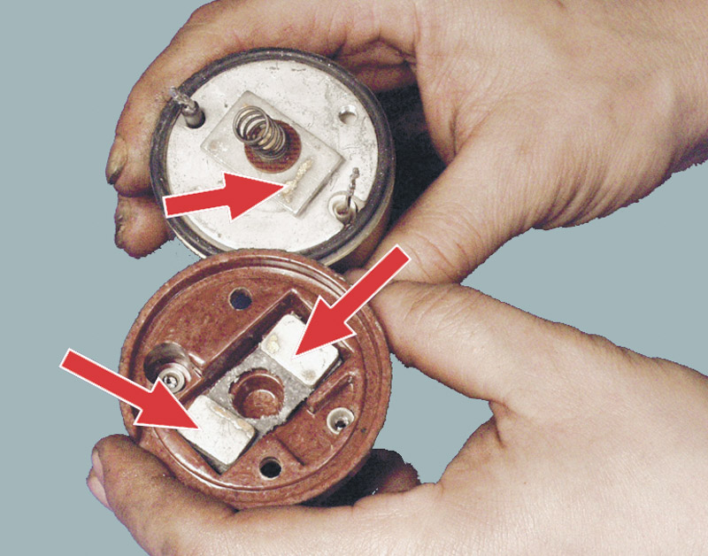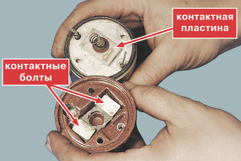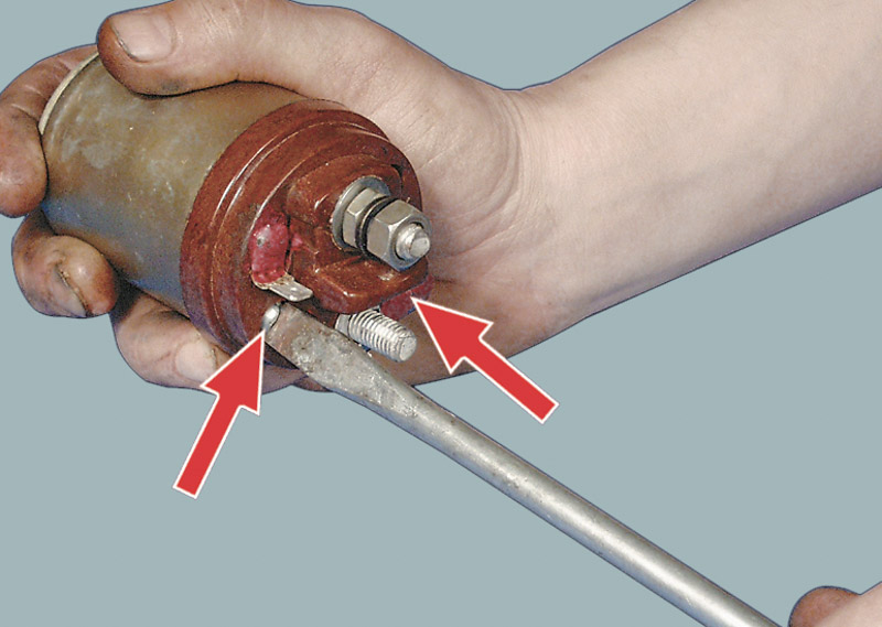 Одночасно з перевіркою опору обмотки перевірте, замикає чи контактна пластина контактні болти тягового реле. Якщо омметр показує нескінченність, то або стався обрив в обмотці, або пластина не замикає контактні болти. У першому випадку тягове реле треба замінити.