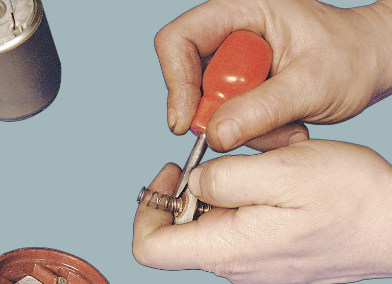 15. Відіжміть викруткою пружини обох ізольованих щіток і вийміть щітки з щіткотримача.