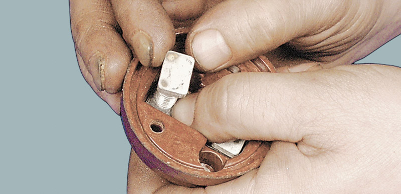57. Огляньте контактні болти. Зачистіть дрібною шкіркою підгорілі головки болтів. При сильному вигорянні головок можна розгорнути болти на 180 °, щоб вони притискалися до контактної пластині невигорілої стороною. Якщо поверхня контактної пластини сильно зношена, то її можна повернути іншою стороною до контактних болтів.