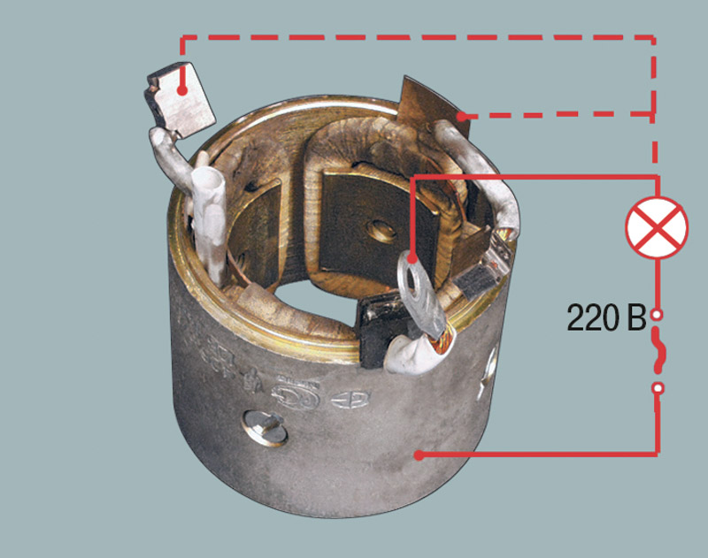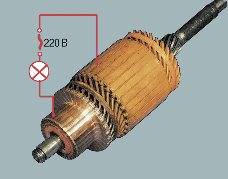 45. Перевірте стан обмотки якоря за допомогою контрольної лампи в колі змінного струму напругою 220 В. Підключіть дроти до пластини колектора і сердечника якоря. Якщо лампа загорілася, значить, є замикання обмотки якоря або пластини колектора на «масу». В цьому випадку треба замінити якір.