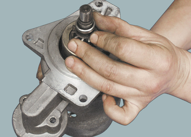46. Утримуючи обгону муфту, спробуйте провернути шестерню стартера в обидві сторони: вона повинна обертатися вільно тільки за годинниковою стрілкою. Якщо шестерня провертається в обидва боки, замініть привід.