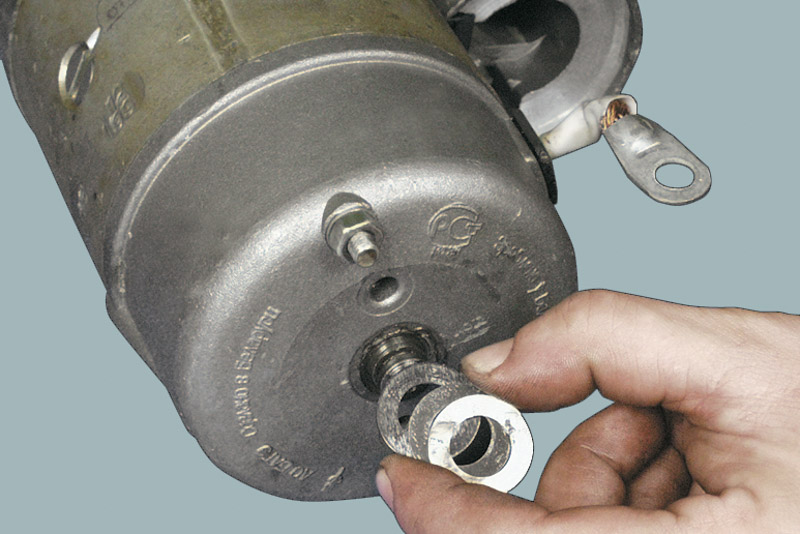 6. Підбором регулювальних шайб відрегулюйте осьовий зазор вала якоря стартера. Зазор повинен бути не більше 0,5 мм.
