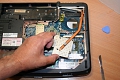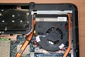 Наступний етап, відкручуємо 4 гвинта і знімаємо кришку, що закриває вентиляційну систему. Нам відкривається доступ майже до всіх елементів ноутбука, включаючи процесор і відеокарту. Для профілактики вентиляційної системи, від'єднуємо роз'єм і відкручуємо три гвинти, що кріплять вентилятор до материнської плати. Знімаємо вентилятор. Далі в порядку черговості знімаємо теплотрубками, відкрутивши по чотири гвинти на кожній, спочатку трубку охолодження центрального процесора і універсального моста від компанії nVidia (саме цей чіп найчастіше виходить з ладу через перегрів), потім теплотрубками охолодження графічного процесора відеокарти.
