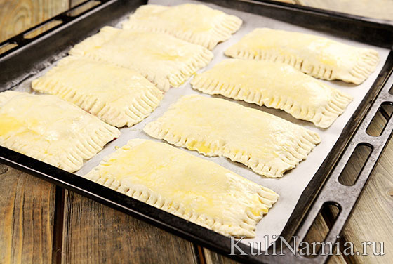 - До цього часу духовка повинна бути прогріта до 200 градусів. Змащуємо заготовки яйцем, викладаємо на деко, покритий пергаментом, і відправляємо в розпечену духову піч на 20-25 хвилин. Тісто має злегка піднятися і підрум'янитися.