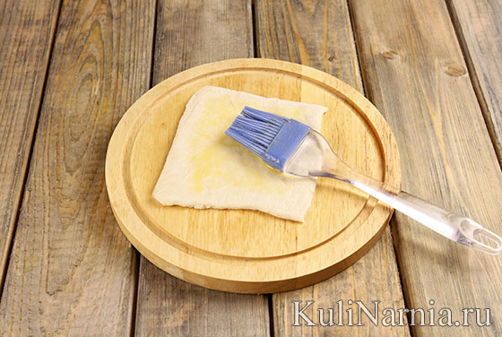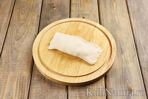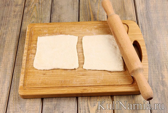 - Робочу поверхню злегка посипаємо борошном, викладаємо попередньо розморожені тісто і розгортаємо до товщини 0,3 см в одному напрямку. Розрізаємо пласт на 8 однакових прямокутників.