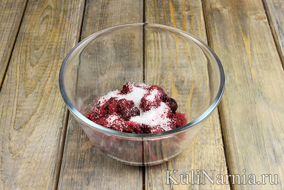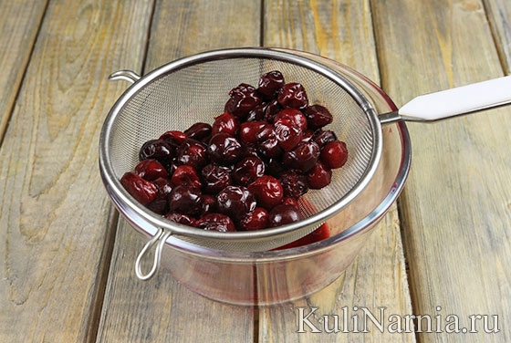 - Вишню заздалегідь розморожуємо, зливаємо сік, що виділився. Ягоду ретельно віджимають.