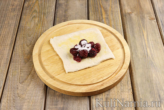 - На половину прямокутника викладаємо порцію вишні. Посипаємо ягоду крохмалем (1/2 ч. Ложки).