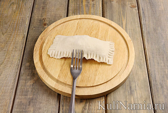 - Для декору і додаткової «склеювання» по краях слойки продавлюємо візерунок зубцями вилки. Таким же чином формуємо ще 7 слоек з вишнею.