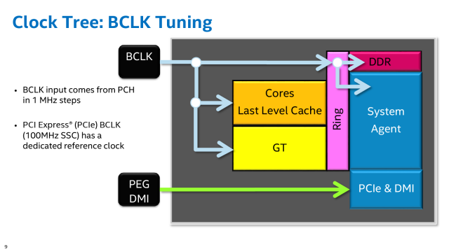 Базова частота залишилася жорстко пов'язана тільки з внутрішніми вузлами CPU: процесорними ядрами, кеш-пам'яттю останнього рівня, вбудованим графічним ядром, кільцевої шиною і контролером пам'яті. Благо, останні відмінно працюють на підвищених частотах. Тобто в новій платформі можна здійснювати розгін не тільки маніпуляціями з множником, а й шляхом підвищення BCLK.