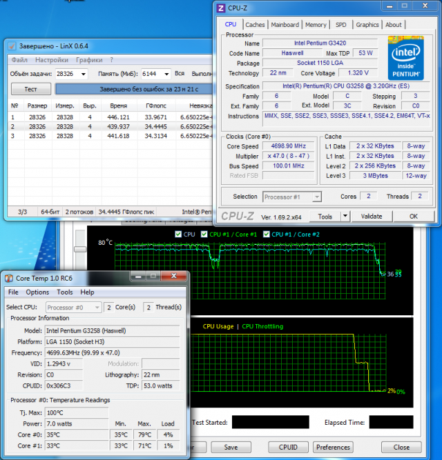 Тепер щодо температури. Якщо компанія Intel вказує значення TCASE = 71 ° C, це означає, що максимально допустима температура в інтегрованому теплорозподільника (IHS) процесора, яку можна вимірювати лише зовнішнім датчиком, досягає 71 ° С. Механізм же пропуску тактів (троттлінг) включається при досягненні 100 ° C за даними внутрішніх датчиків ядер. Тому, грубо кажучи, показник TCASE на рівні 71 ° С можна вважати рівносильним 100 ° С внутрішніх датчиків ядер.