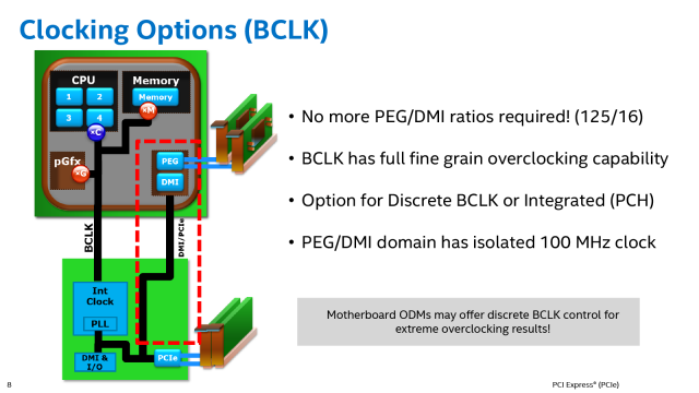 У процесорах Intel Skylake інженери виділили шину PCI Express і чіпсет в окремий домен, частота якого залишається фіксованою, незалежно від змін BCLK.