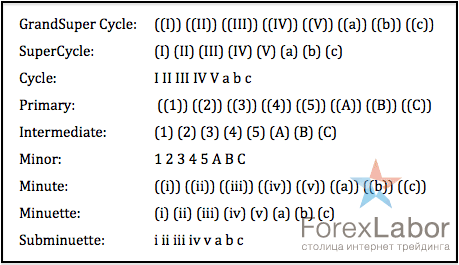 На наведеному вище малюнку зображено способи маркування хвиль Елліотта різного рівня. Як говорив Елліотт, використання такого маркування для ідентифікації ступеня або рівня хвиль, що лежать в основі тренда. Великими римськими цифрами позначаються хвилі основного рівня, звичайними цифрами позначаються хвилі середнього рівня і маленькими римськими цифрами позначаються хвилі меншого рівня. Тренди починаються з хвиль Елліотта головного рівня (Grand Supercycle), які складаються з хвиль дрібного рівня. Наприклад, хвиля основного рівня (Cycle) на рівень вище, ніж хвиля первинного рівня (Primary). У свою чергу хвиля первинного рівня (Primary) на порядок нижче хвилі основного рівня (Cycle). Формулювання типу «хвиля 1 хвилі (1)» говорить про те, що хвиля 1 є частиною хвилі (1) більшого рівня, при цьому хвиля 1 є хвилею нижчого рівня, ніж хвиля (1).