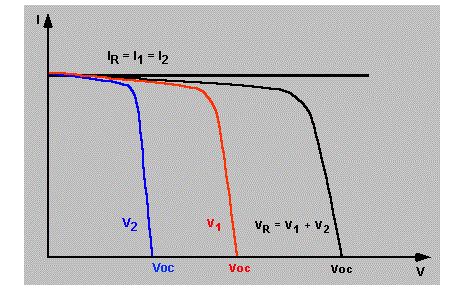 Невідповідність напруги холостого ходу при послідовному з'єднанні щодо вигідно. Як показано на наступній анімації в точці короткого замикання загальний струм модуля залишається незмінним. Потужність модуля в точці максимальної потужності зменшується через більш низьку продуктивність «поганого» сонячного елемента. Так як два елементи підключення послідовно, через них тече однаковий струм, а результуюча напруга можна знайти, склавши напруги на кожному з двох елементів.