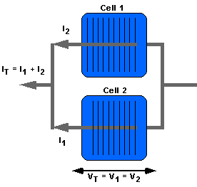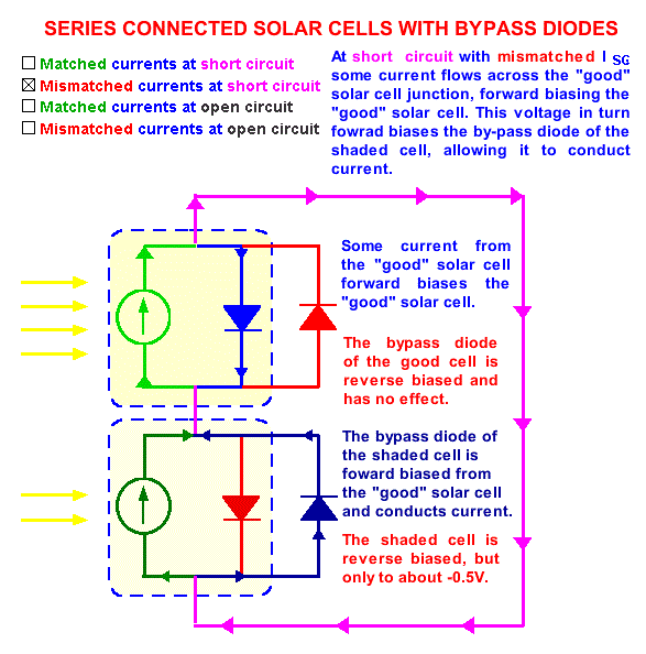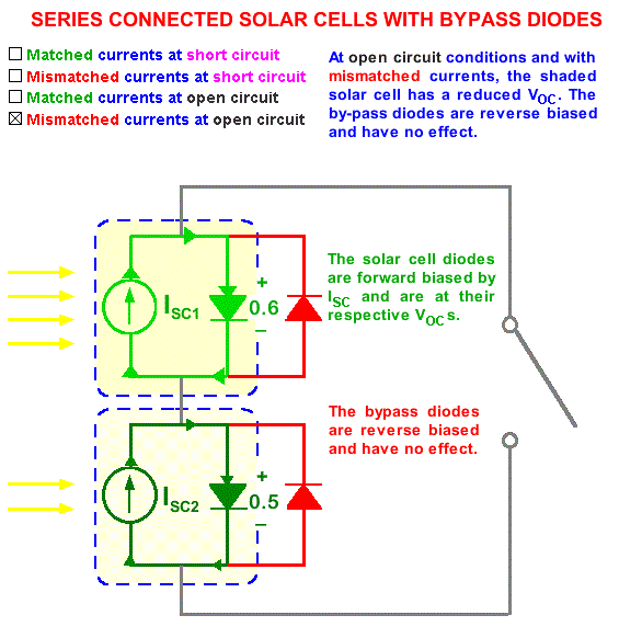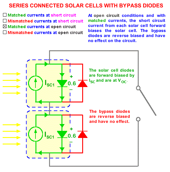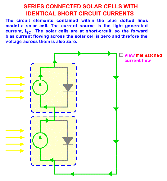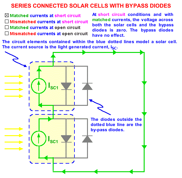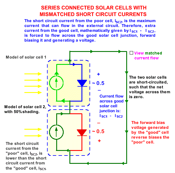 Последователно з'єднаний сонячні елементи з однаковими струмами короткого замикання. Елементи схеми, об'єднані синьою пункітрной Лінина представляють собою модель сонячного елемента. Джерелом струму є світловий струм, Isc. Сонячні елементи знаходяться в режимі короткого замикання, тому струм прямого зміщення, поточний через сонячні елементи, дорівнює нулю і напруга теж дорівнює нулю. Невідповідні струми кортокого замикання. Максимальним струмом, який може текти через контур, є струм короткого замикання поганого елемента. Тому додатковий струм через хороший елемент, рівний Isc1 - Isc2 змушений текти через хороший елемент, зміщуючи його в прямому напрямку і створюючи напруження. На малюнку вихідна напруга другого елементу менше, ніж у першого.