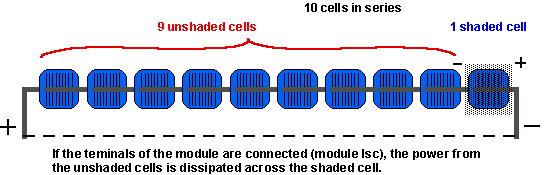 Запобігання локального перегріву за допомогою обвідного діода. Для наочності тут використовується всього 10 елементів, один з яких затінений. Зазвичай модуль складається з 36 елементів і невідповідність струмів під час відсутності обвідного діода призводить до ще більш поганих наслідків, але при наявності обвідного діода вони стають несуттєвими. Як би там не було, на практиці використовувати обвідний діод для кожного елемента занадто дорого, тому їх зазвичай включають відразу для декількох елементів. Напруга на затіненому елементі, або будь-якому елементі, який виробляє низький струм, дорівнює напрузі прямого зміщення інших послідовно з'єднаних елементів плюс напруга на обвідному діод, який з ними з'єднаний. Це показано на зображенні нижче. Напруга на НЕ затінених сонячних елементах залежить від ступеня затінення поганих елементів. Наприклад, якщо елемент повністю затінений, то чи не затінені елементи будуть зміщені в прямому напрямку їх струмами короткого замикання і напруга буде дорівнювати приблизно 0.6В. Якщо поганий елемент затінений лише частково, то частина струму від хороших елементів може текти через ланцюг, а залишився ток змістить кожен сонячний елемент в прямому напрямку, приводячи до більш низьку напругу прямого зміщення на кожному елементі. Максимальна розсіювання енергії на затіненому елементі приблизно дорівнює енергії, виробленої залишилися елементами в ланцюзі. Максимальна кількість елементів, яке можна убезпечити від локального перегріву за допомогою одного обвідного діода дорівнює 15. Тому в звичайному модулі з 36 елементів для цього використовується 2 обвідних діода.