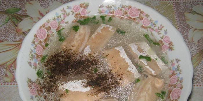 - Взяти черевця, половину моркви, цибулину, зварити бульйон, який потім процідити через марлю.