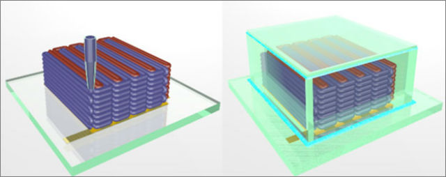Вчені вирішили, що можна створити досить потужну батарейку, якщо сконструювати шари з міцно переплетених ультратонких електродів, побудованих поза площиною. Для цього вони використовували технологію 3D-друку. Принтер слідує інструкціям комп'ютерної програми, де була заздалегідь створена тривимірна модель майбутнього устрою, і "друкує" фізичний об'єкт шар за шаром з потрібних матеріалів. Сьогодні тривимірна друк використовується в дуже багатьох виробничих галузях, починаючи з медицини і закінчуючи зброєю і прототипами автомобілів .