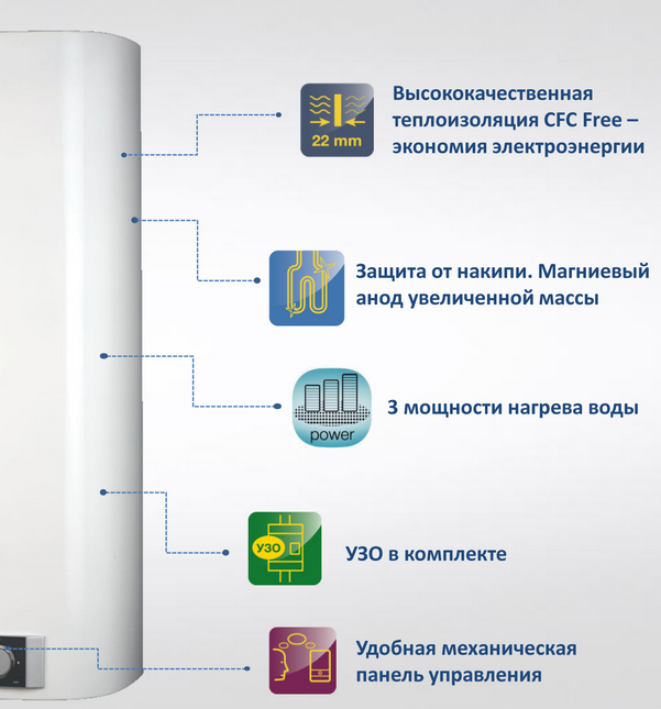 Нагрівання води здійснюється від двох незалежних нагрівальних елементів «сухого» типу, сумарною потужністю Потужність 2000 Вт. Тени знаходяться в спеціальних металевих колбах, закріплених в нижній частині бака. Така конструкція має ряд переваг, на відміну від простих ТЕНів «мокрого» типу. «Сухий» нагрівальний елемент не контактує з водою, а значить на ньому не утворюється накип, не погіршується тепловіддача, тим самим продовжується термін його експлуатації. Технологія «X-Heat» дозволяє користуватися бойлером навіть в разі поломки одного нагрівального елементу.