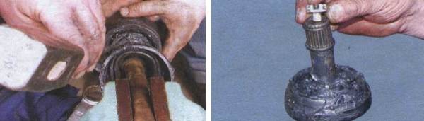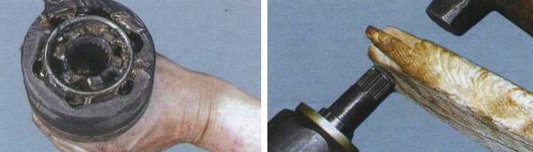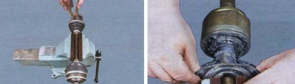 Внутрішній шарнір висувається з коробки досить вільно шляхом легких постукувань молотком і спеціальної надставкою. Приводний вал зручно закріплюємо в слюсарні лещата, і приступаємо до розбирання зовнішнього шарніра. Послідовно знімаємо кріпильний хомут, чохол, зовнішню і внутрішню частини шарніра.